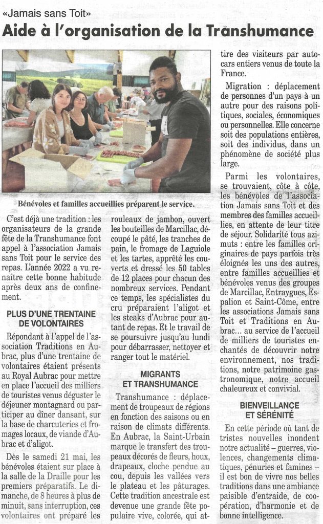 Chaque année, depuis la reprise après la période COVID, l’association qui met en œuvre la manifestation touristique de la transhumance de printemps des troupeaux de vache vers les estives de l’Aubrac nous demande d’assurer les services de repas. Et pendant deux jours, c’est dressage des tables, mises à disposition des plats, plonge et rangement du site.